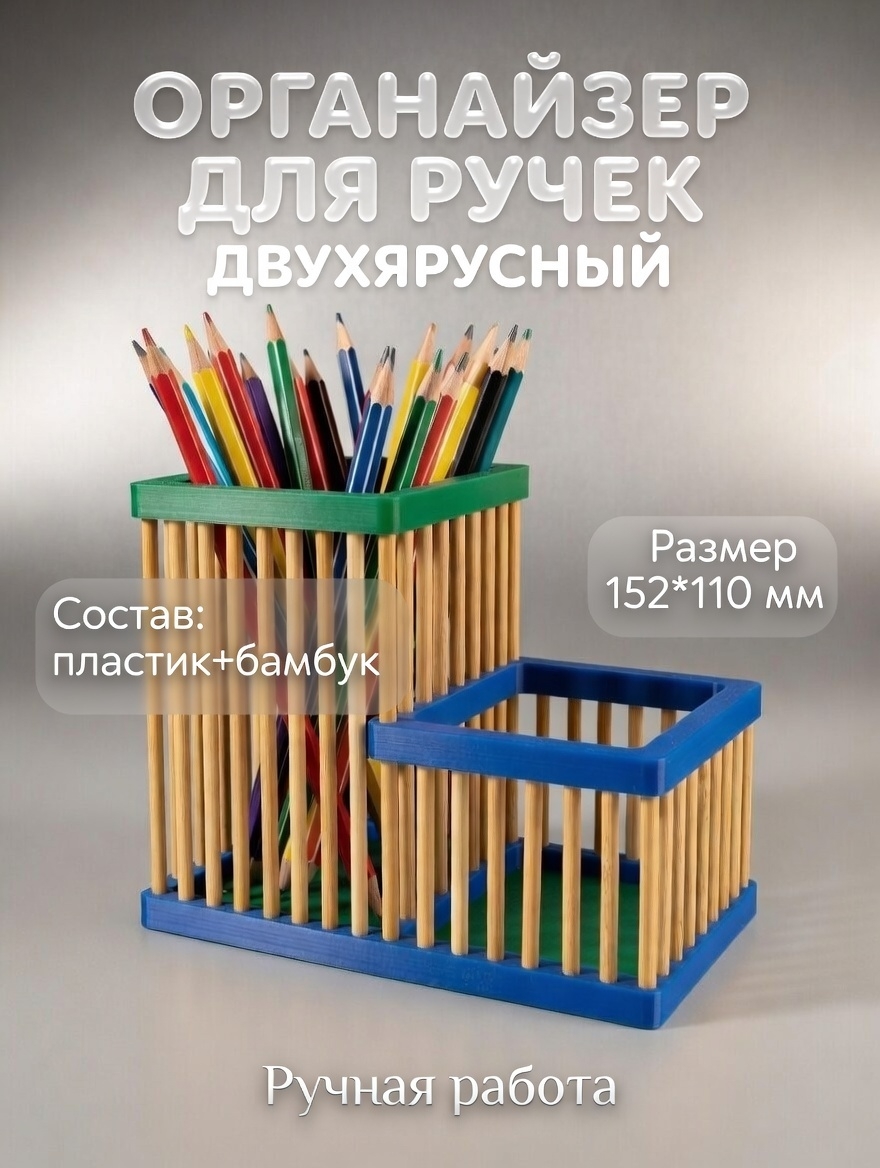 Стильный, экологичный и уникальный органайзер для ручек, карандашей и кистей. Изготовлен из натурального бамбука и биоразлагаемого пластика с эффектом перламутрового перелива. Каждое изделие создается методом 3D-печати и имеет неповторимый рисунок как бамбука, так и пластика.